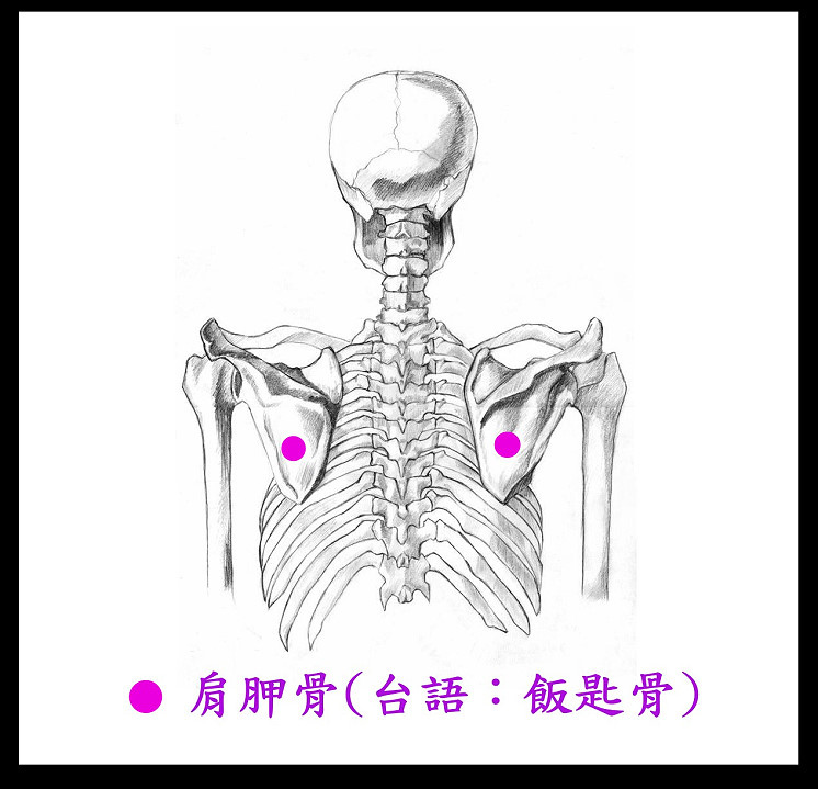 (一)頸部的左邊卡住,則找背部左邊的「肩胛骨」(台語叫「飯匙骨」)。