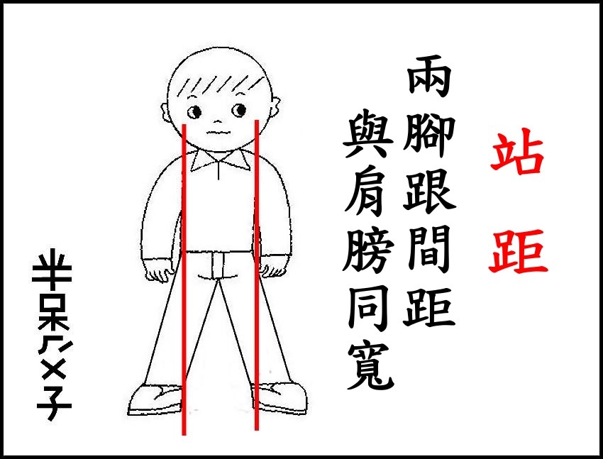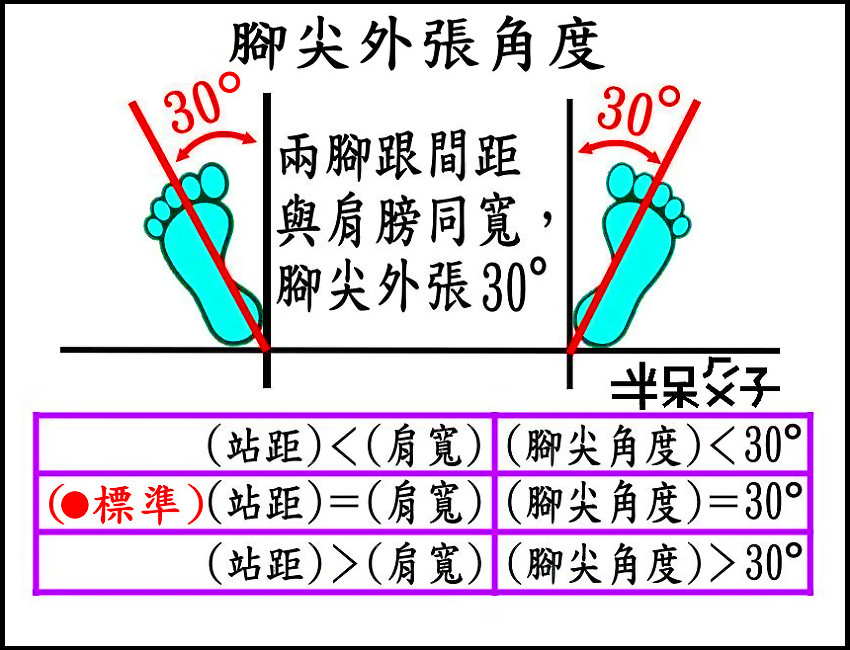 ●兩腳跟間距與肩同寬,腳尖外張約 20° ~ 30°左右,