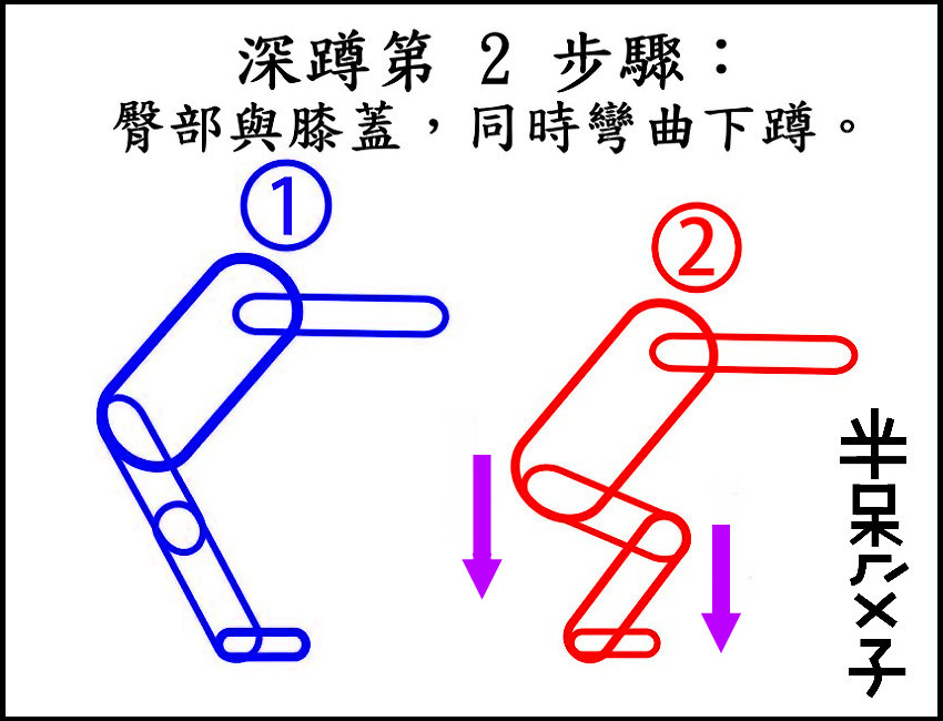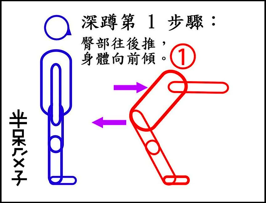 ●(二)第 2 步驟:(臀部與膝蓋,同時彎曲下蹲。)
