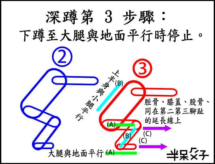 (半深蹲):大腿與地面平行。