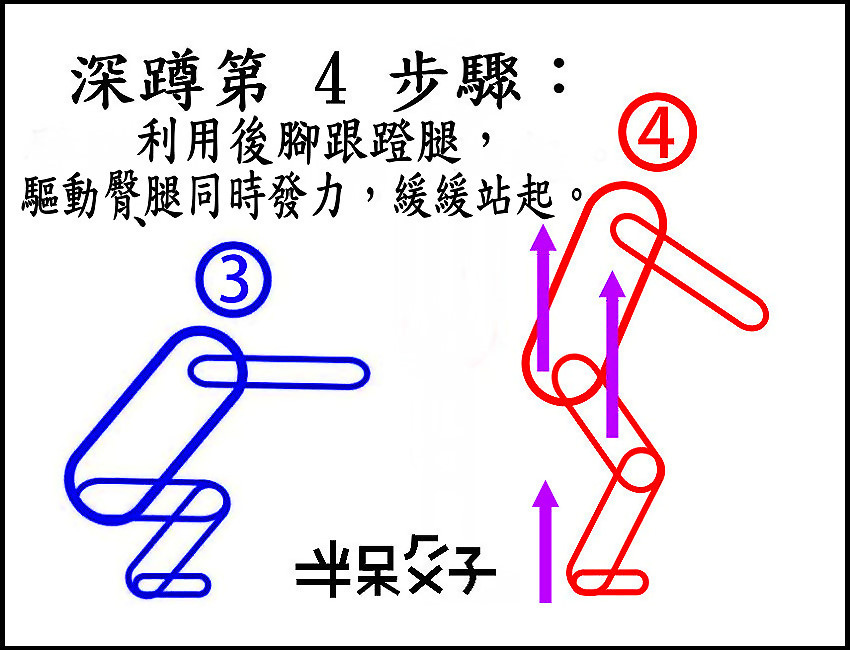 ●(四)第 4 步驟:(後腳跟蹬腿,驅動臀、腿同時發力,緩緩站起。)