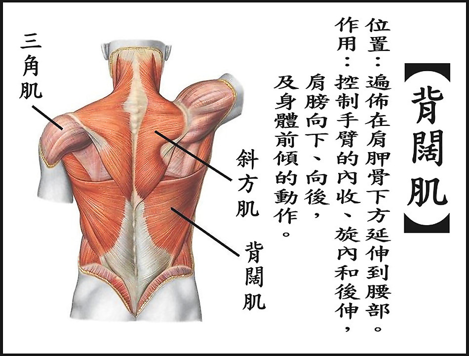 ●遍佈在肩胛骨下方延伸到腰部,是我們背部面積最大的一塊肌肉。