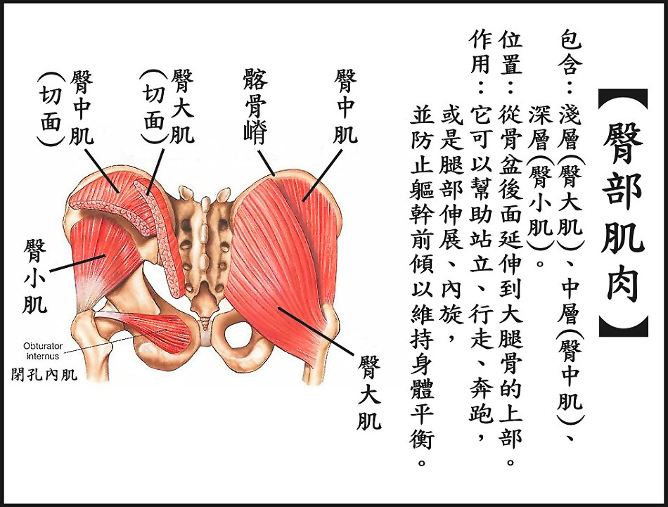 ●臀部肌肉分三層,包含淺層(臀大肌)、中層(臀中肌)、深層(臀小肌)。