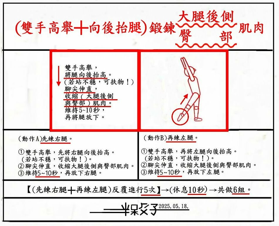 ●(參)(雙手高舉+向後抬腿)鍛鍊(大腿後側+臀部)肌肉。